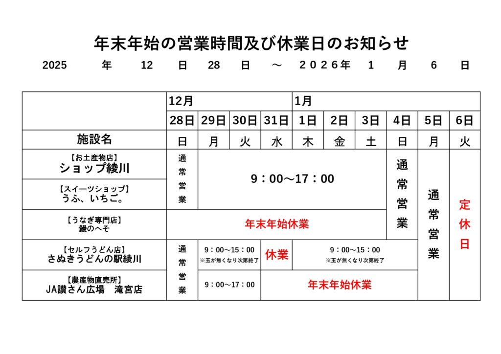 年末年始の営業時間及び休業日のお知らせ 投稿日 2025年12月22日 著者 道の駅滝宮 カテゴリー お知らせ 日頃より道の駅滝宮をご愛顧いただき誠にありがとうございます。 今年度の年末年始の営業時間及び休業日をお知らせいたします。